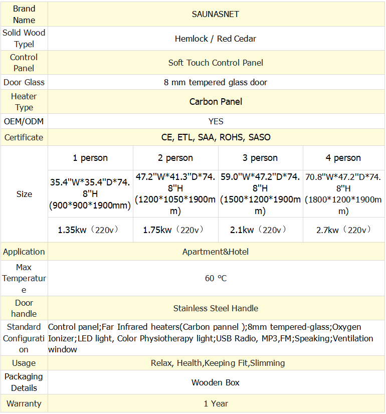 full spectrum and carbon panel, with wooden sauna house as the carrier. The heating plate is inlaid around the sauna room, the heating is even and stable wave band; with intelligent control system, the time and temperature are adjustable.