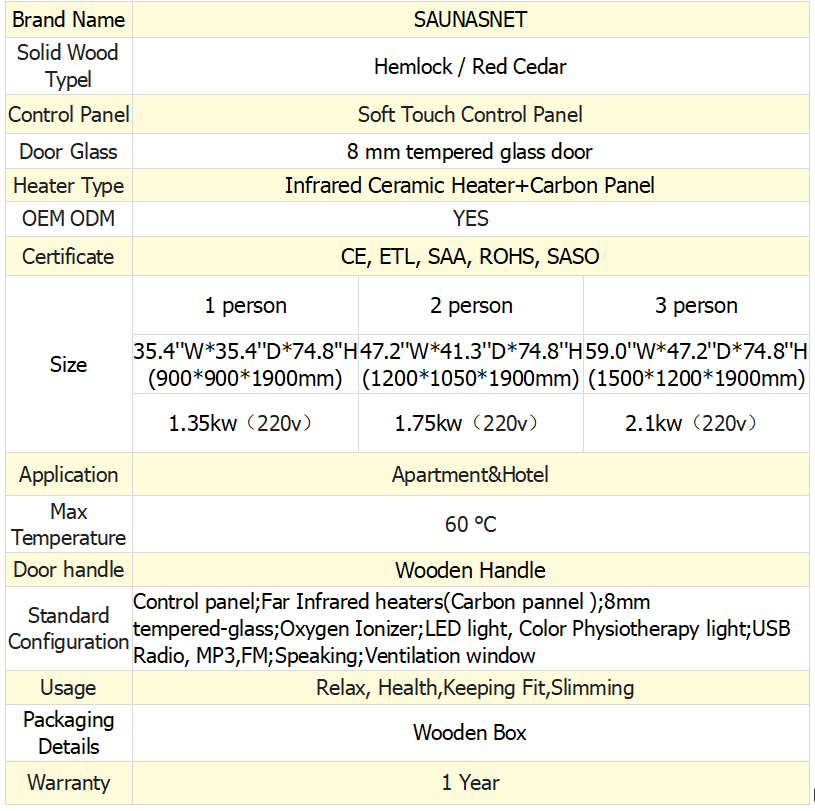 full spectrum and carbon panel, with wooden sauna house as the carrier. The heating plate is inlaid around the sauna room, the heating is even and stable wave band; with intelligent control system, the time and temperature are adjustable.