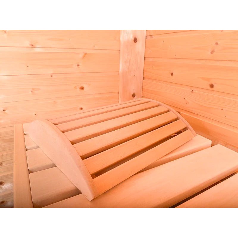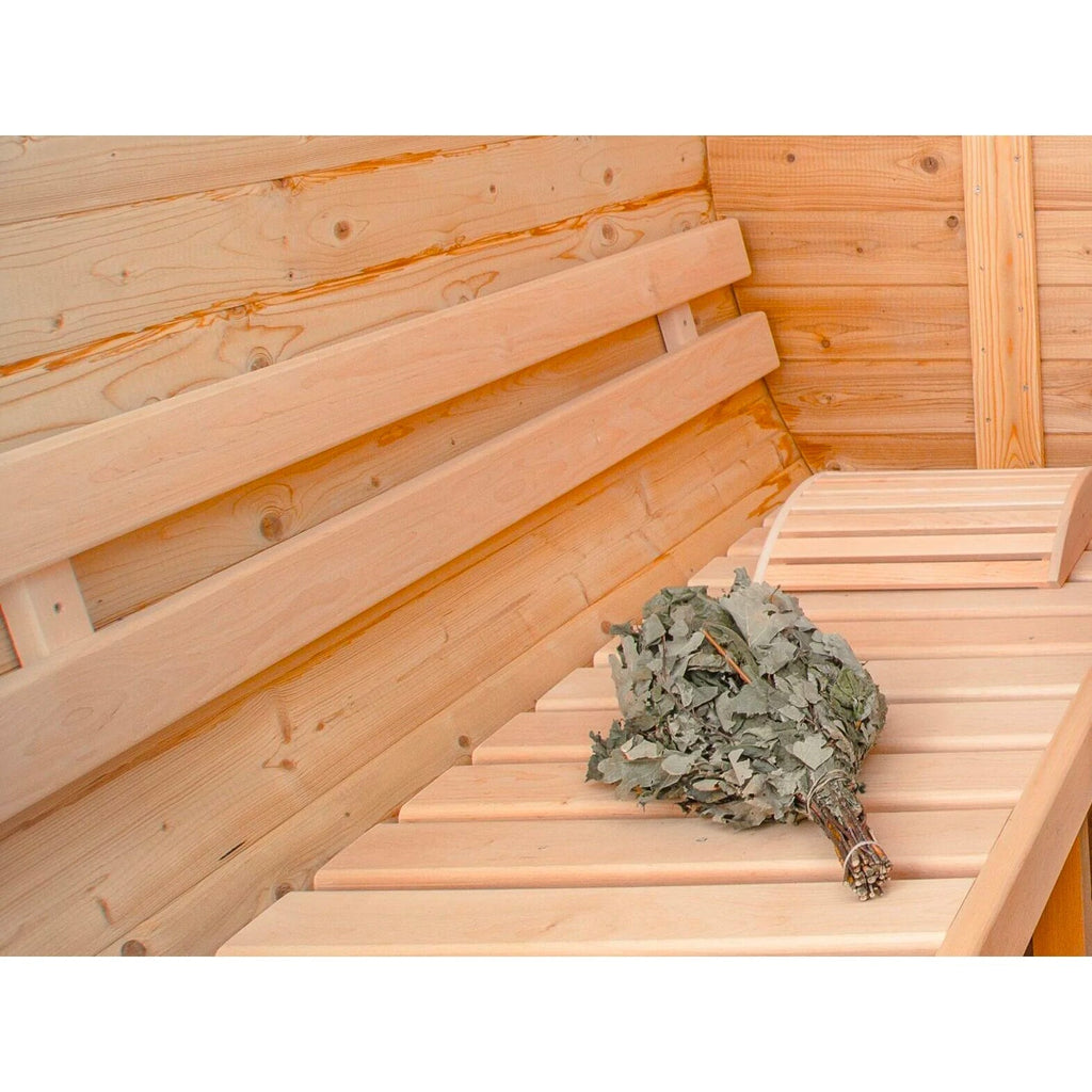 This Barrel sauna was made of hemlock wood. Upon the customer’s request, we can install a wood-fired furnace or an electric heater in the barrel sauna. The thickness of the sauna barrel walls is 38 mm; the thickness of the solid wood flooring is 18 mm. The roof of the sauna can be made of bitumen shingles.