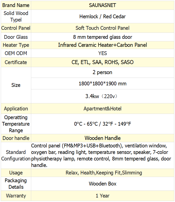 The sauna room is made of spliced panels, and the sauna room has fixed card slots, which can be easily installed by only 2 people. If you encounter any unclear problems during installation, we can provide video guide installation here. Or you can choose our installation package, we will have a cooperative installation company to install the sauna room on site (except for electrical installation).You could receive your disassembled sauna in the morning and be ready to enjoy it that night!