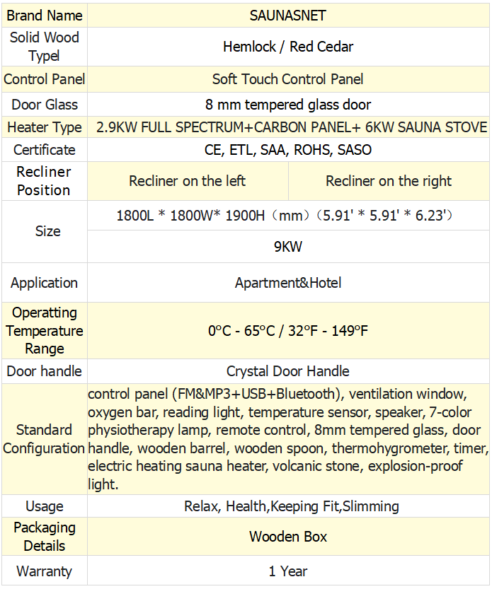 The sauna room is made of spliced panels, and the sauna room has fixed card slots, which can be easily installed by only 2 people. If you encounter any unclear problems during installation, we can provide video guide installation here.Or you can choose our installation package, we have a cooperative installation company to install the sauna room on site (except for electrical installation)You could receive your disassembled sauna in the morning and be ready to enjoy it that night!